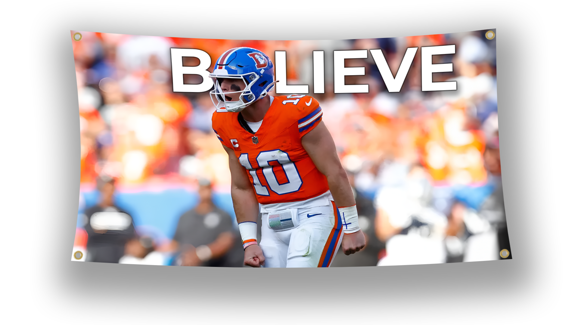 "BOLIEVE in Bo Nix" with this stunning flag that celebrates the Denver Broncos' rising star quarterback! Featuring Bo Nix front and center with the inspiring 'BOLIEVE' slogan, this flag is a must-have for any Broncos fan, Bo Nix supporter, or dedicated football enthusiast. Whether you're showcasing your pride on game day, decorating your man cave, or looking for the perfect piece of NFL memorabilia, this flag captures the excitement and hope Bo Nix brings to the field. Crafted with bold colors and high-quality materials, this limited edition Bo Nix flag is designed to stand out, whether it’s waving proudly in your yard, hanging in your fan cave, or displayed at tailgates. Perfect as a gift for Broncos fans, this flag celebrates the journey of Bo Nix, a player whose leadership and skill embody what it means to "BOLIEVE." Add this unique Broncos collectible to your collection and cheer for Bo Nix as he leads Denver with passion and promise. Show the world your faith in the future of Broncos football—because real fans always BOLIEVE!"